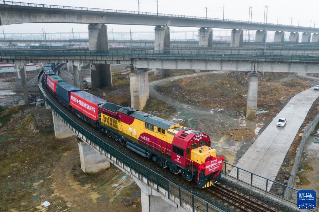 1月6日,开往老挝万象的中老铁路(怀化—万象)国际货运列车从湖南怀化国际陆港发车(无人机照片)。