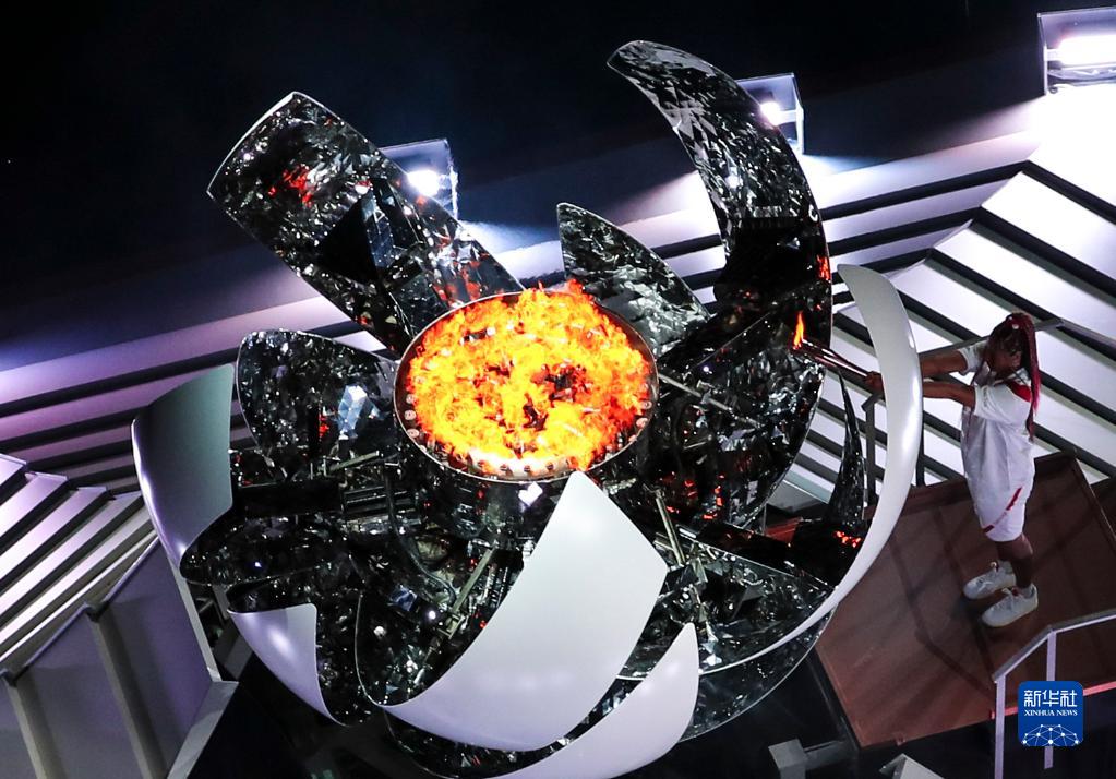 2021年7月23日,日本运动员大坂直美在开幕式上点燃主火炬(高空遥控相机照片)。