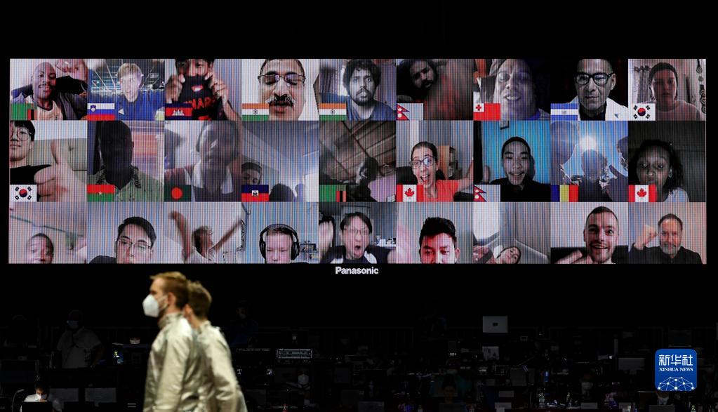 2021年7月28日,在东京奥运会击剑项目男子佩剑团体赛现场,大屏幕显示在线收看直播的观众画面。