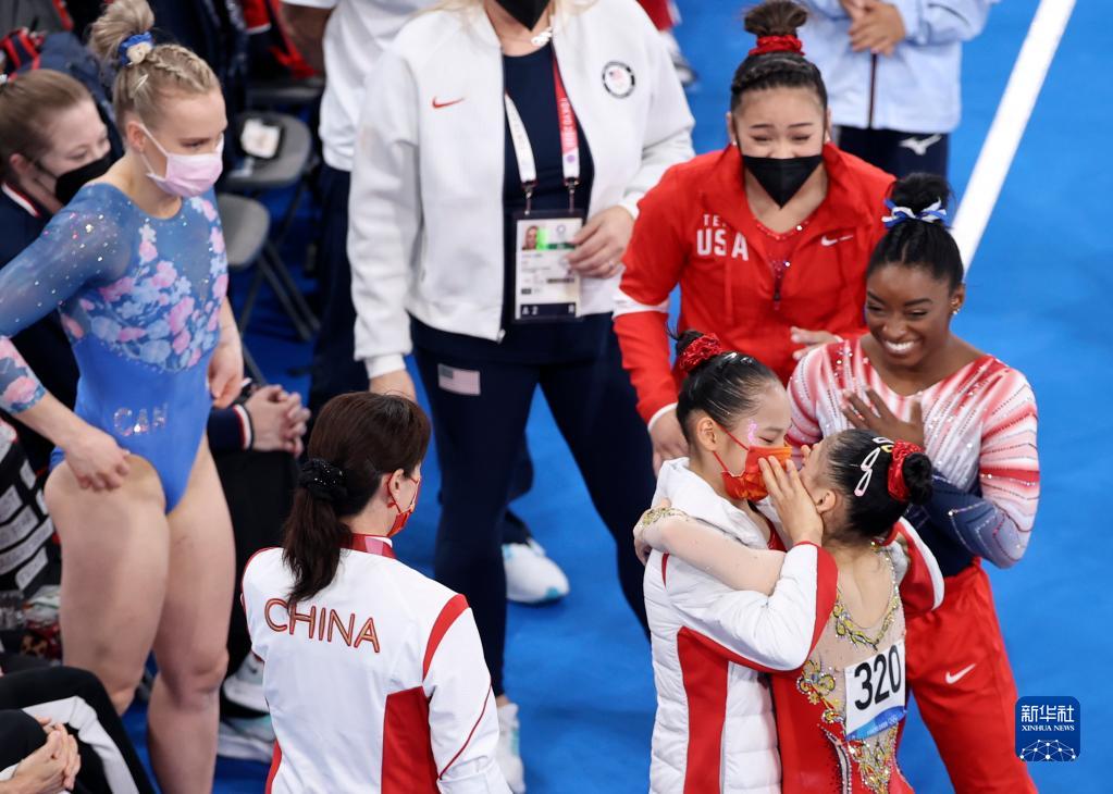 2021年8月3日,中国选手管晨辰(下右)与队友唐茜靖在比赛后相拥,两人身旁的其他参赛选手纷纷向她们表示祝贺。