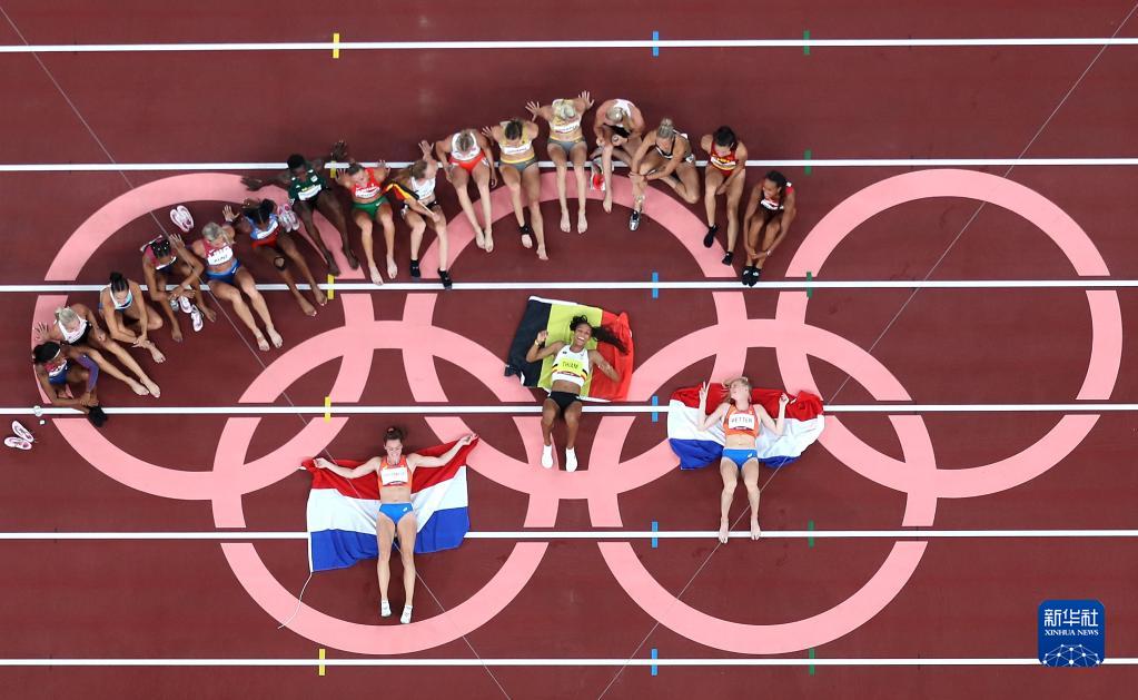 2021年8月5日,东京奥运会田径项目女子七项全能选手在比赛后合影(高空遥控相机照片)。