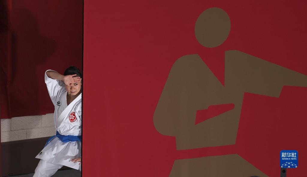 2021年8月5日,在东京奥运会空手道女子型比赛前,即将上场参赛的中国香港选手刘慕裳在场边热身。