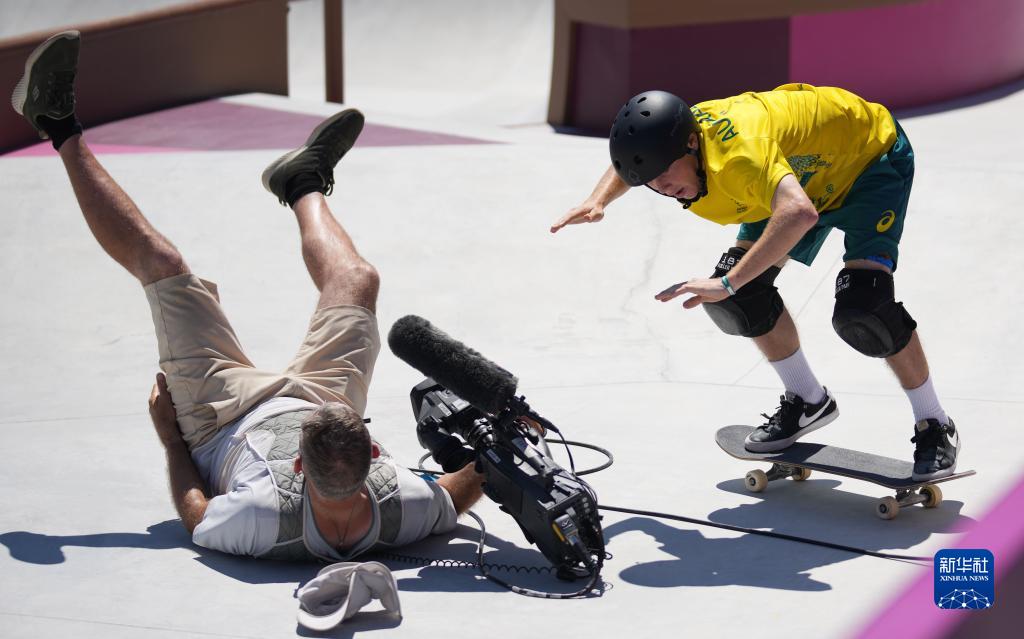 2021年8月5日,澳大利亚选手帕尔默(右)在东京奥运会男子滑板公园赛预赛中撞倒一名摄像师。