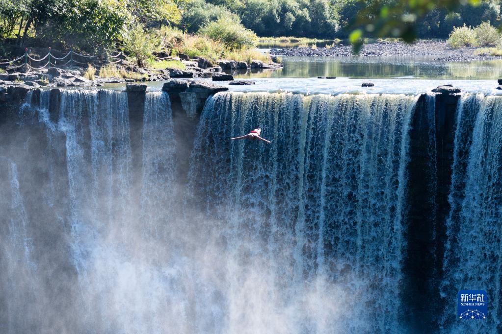 这是狄焕然在镜泊湖吊水楼瀑布上纵身跃入水中(2021年9月17日摄)。