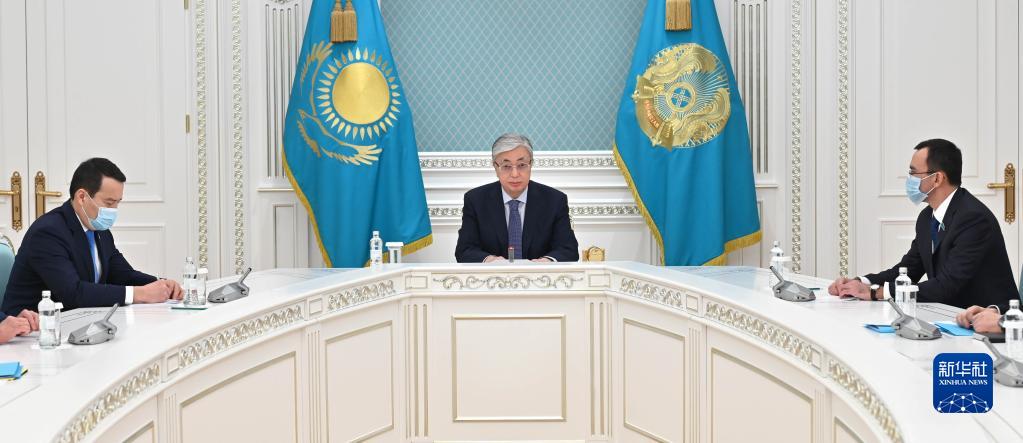 1月6日,哈萨克斯坦总统托卡耶夫(中)在努尔苏丹出席安全会议。