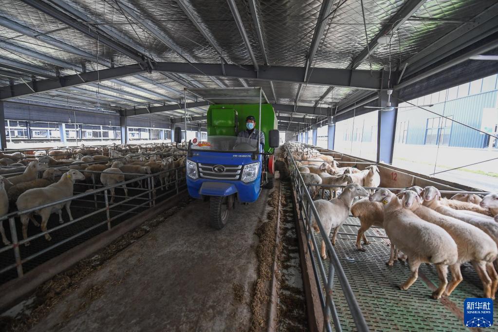 1月6日,工作人员在浙江省湖州市长兴县吕山乡湖羊智慧循环产业园的标准化高架棚羊舍里开着饲料车喂羊。
