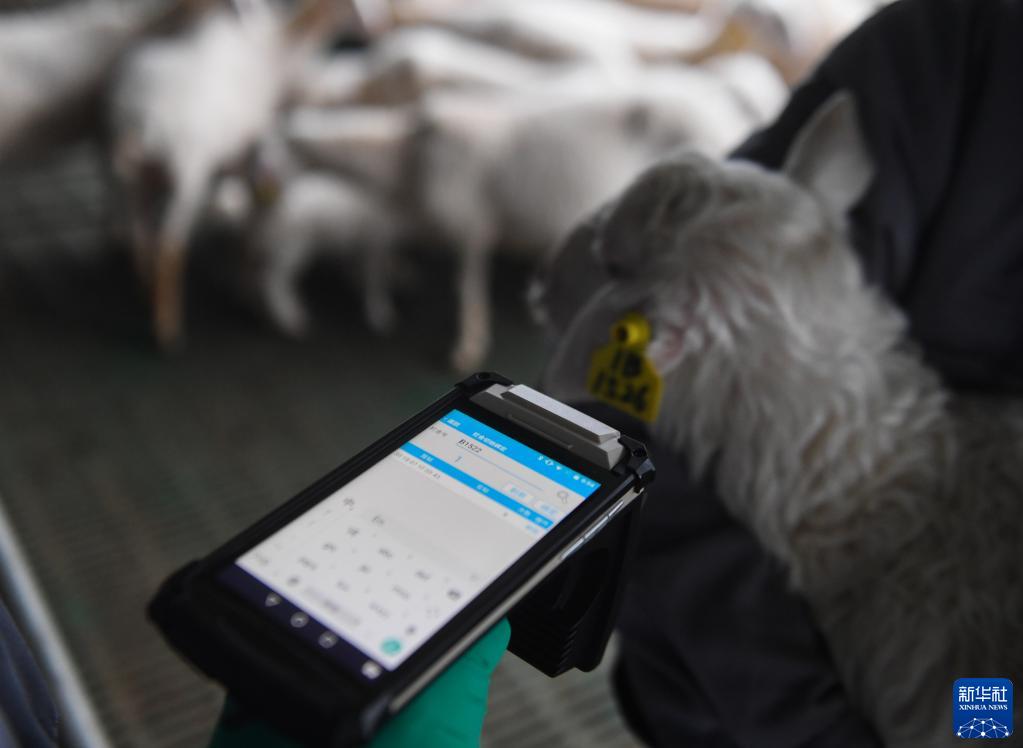 1月6日,浙江省湖州市长兴县吕山乡湖羊智慧循环产业园的工作人员在扫描湖羊幼仔耳朵上的数字芯片。