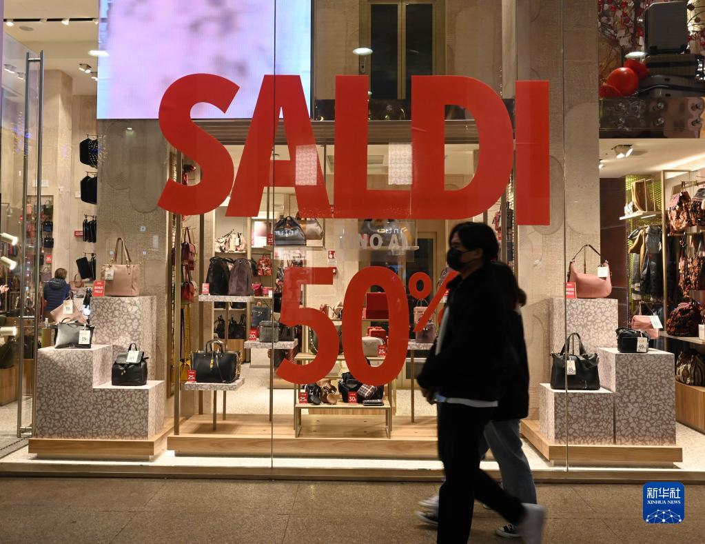 这是1月6日,人们经过意大利米兰一处店铺的冬季打折季广告牌。