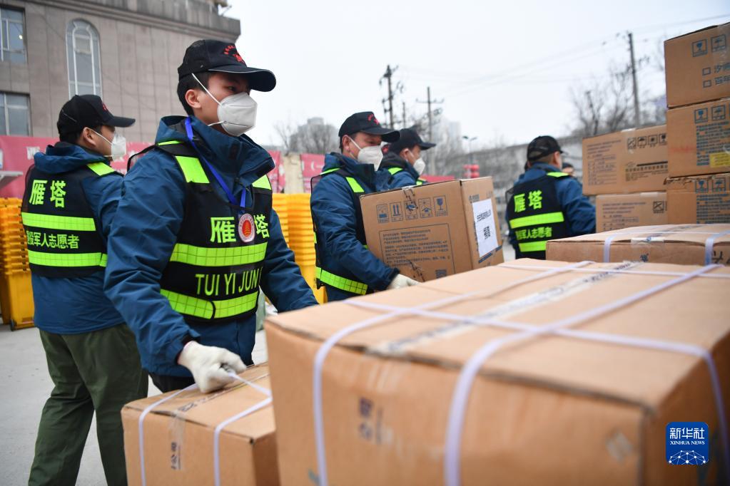 1月6日,西安市雁塔区退役军人志愿突击队队员搬运防疫物资。