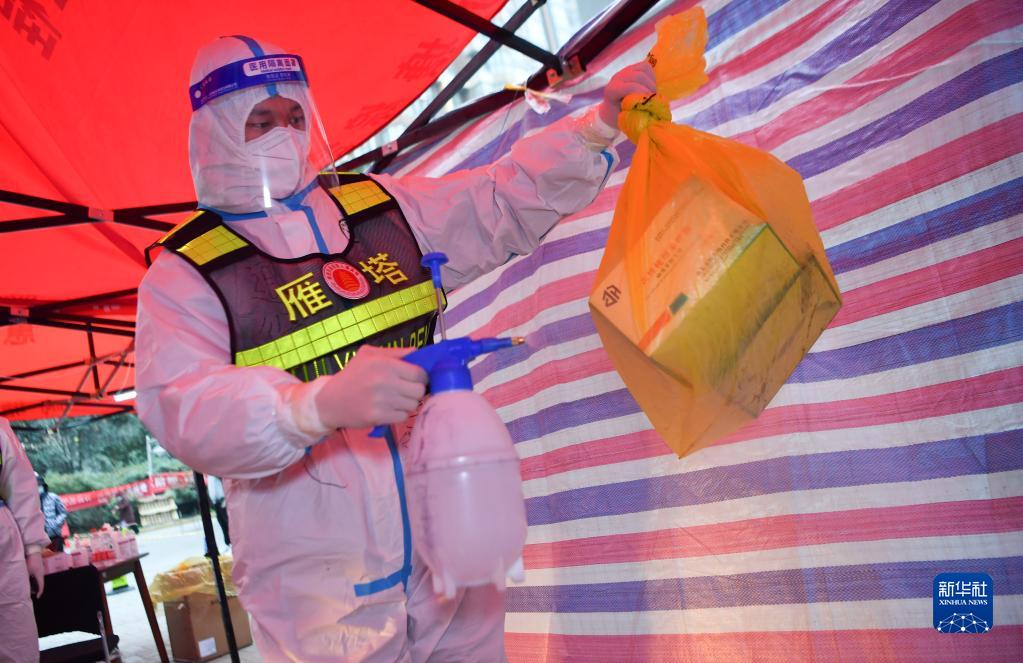 1月7日,西安市雁塔区退役军人志愿突击队队员桑海鑫为核酸检测样本外包装消毒。