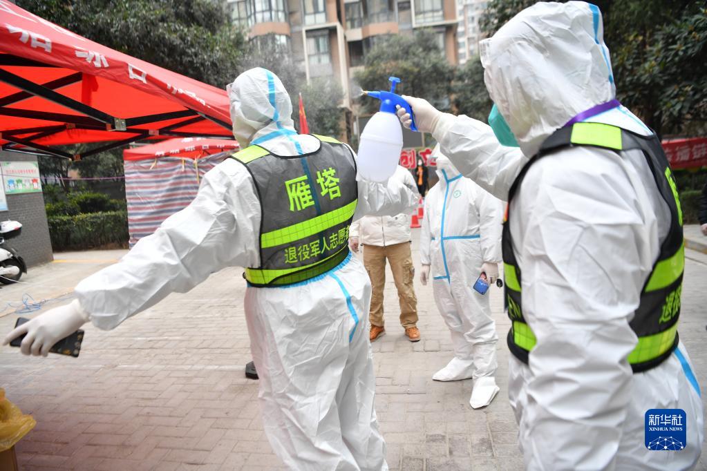 1月7日,西安市雁塔区退役军人志愿突击队队员在一处核酸检测点互相协助为防护服消毒。