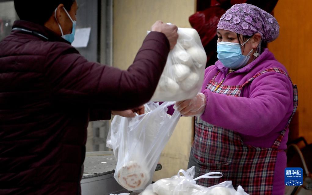 1月7日,西安市未央区西唐寨村村民在村里的馒头店买馒头。