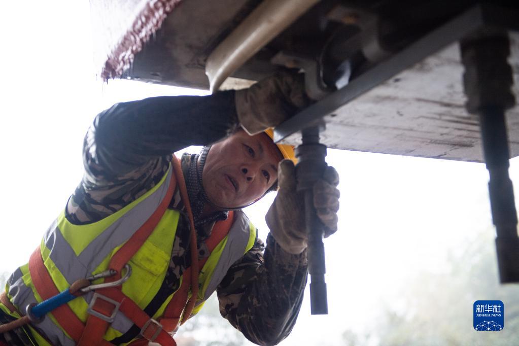 1月8日,在常益长铁路建设工地,中铁五局工作人员在为箱梁架设进行准备工作。