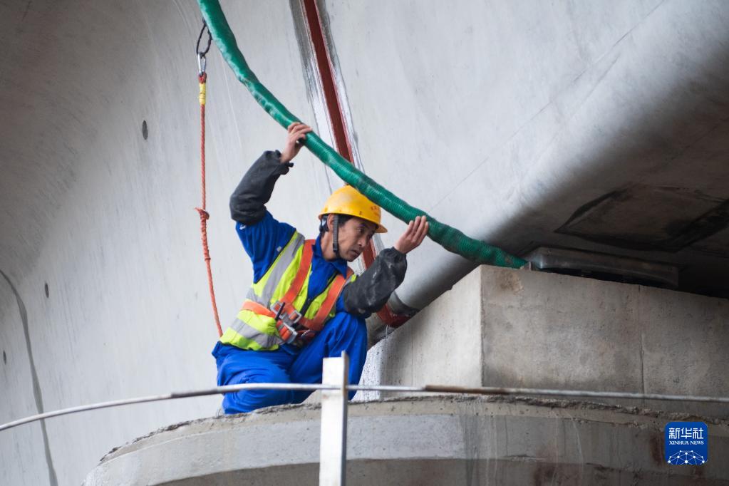 1月8日,在常益长铁路建设工地,中铁五局工作人员在落梁后对箱梁进行灌浆加固。