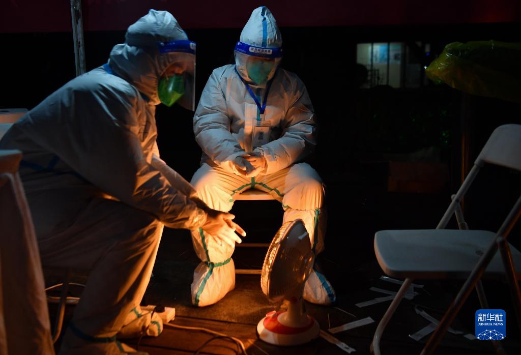 2021年12月31日,在西安曲江风景线小区,两名志愿者在核酸检测工作结束后取暖。