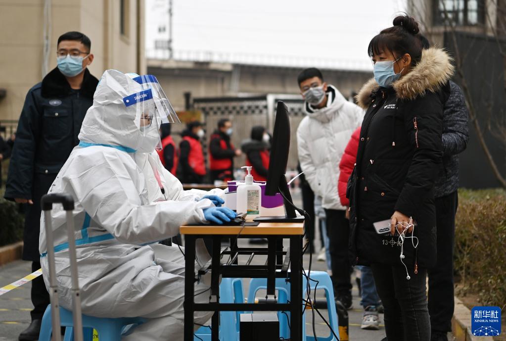 1月9日,在天津市西青区中北镇锦曦花苑社区一处核酸检测点,居民在排队录入信息。新华社记者 李然 摄
