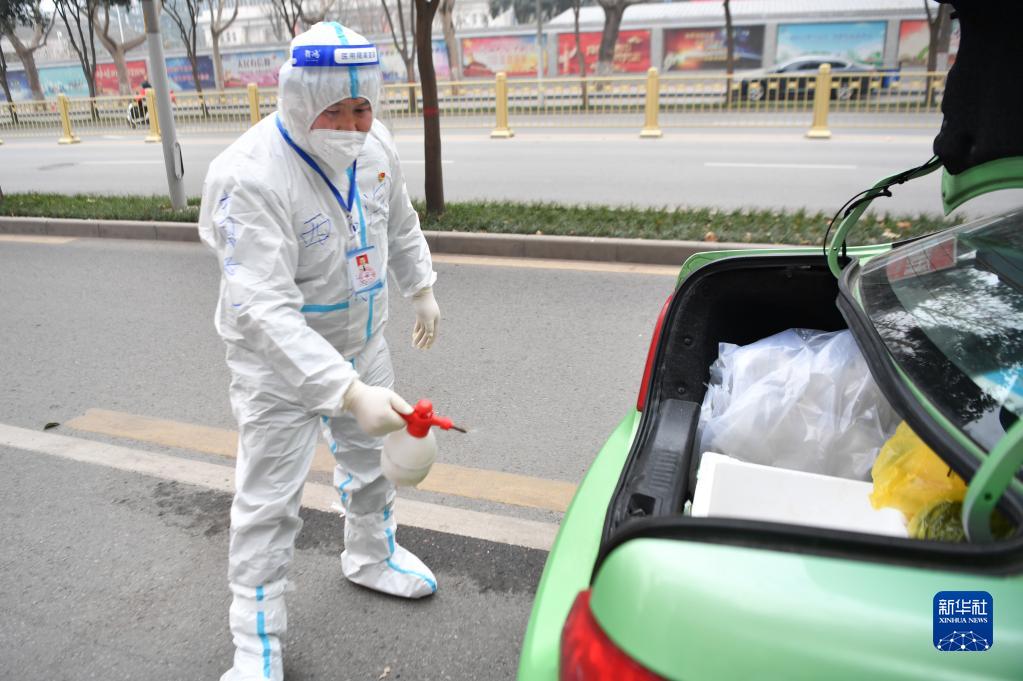1月5日,西安市“的哥”王锋利在出发转运核酸检测样本前为车辆消毒。
