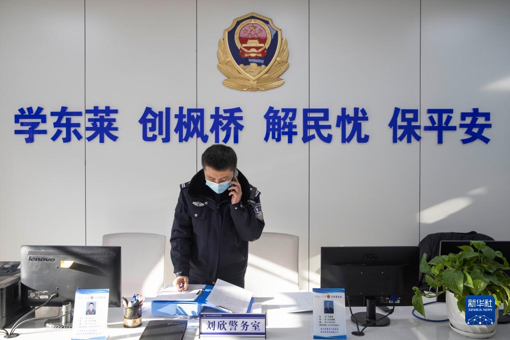1月9日,在七台河市桃山区,刘欣在警务室里接电话。