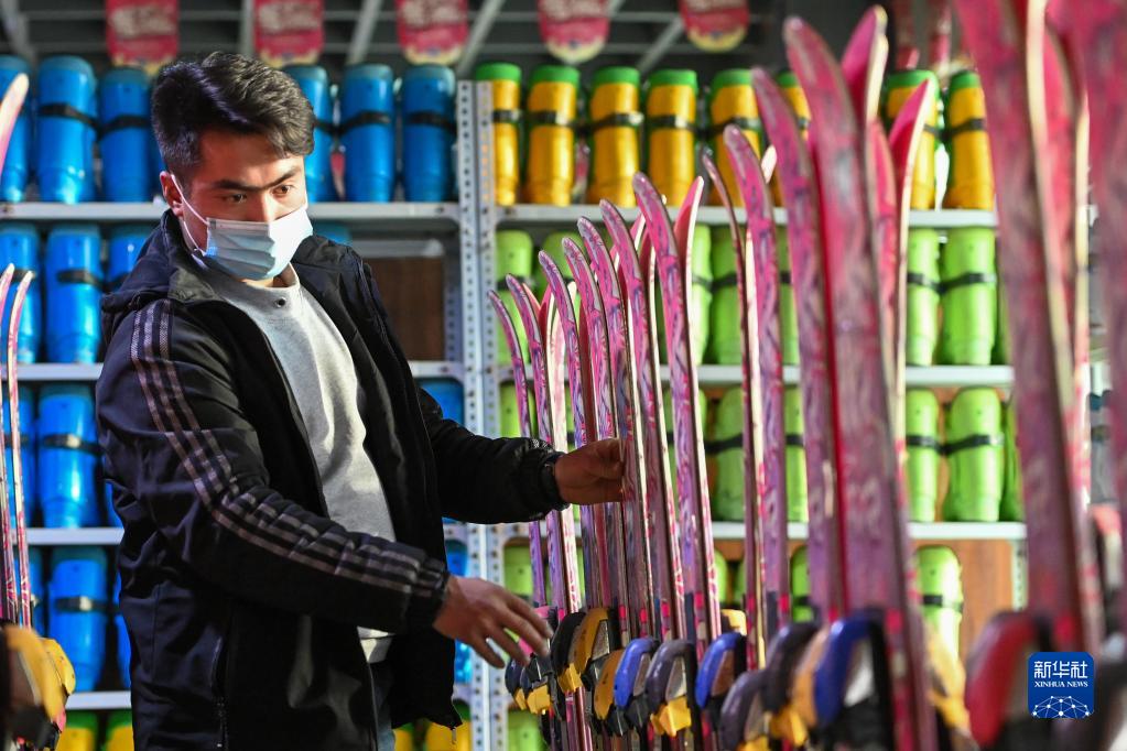 游客在新疆墨玉县舞伊纳克滑雪场挑选雪具(1月9日摄)。