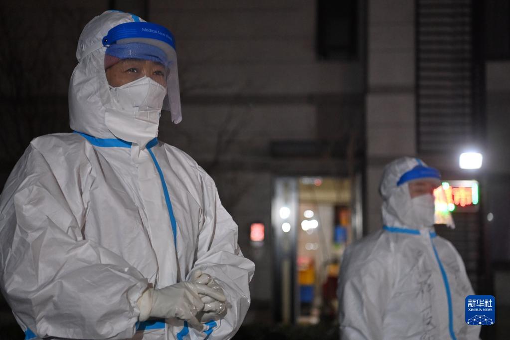 1月9日晚,在天津市西青区中北镇锦曦花苑社区一核酸检测点,医务人员利用工作空隙起身活动。