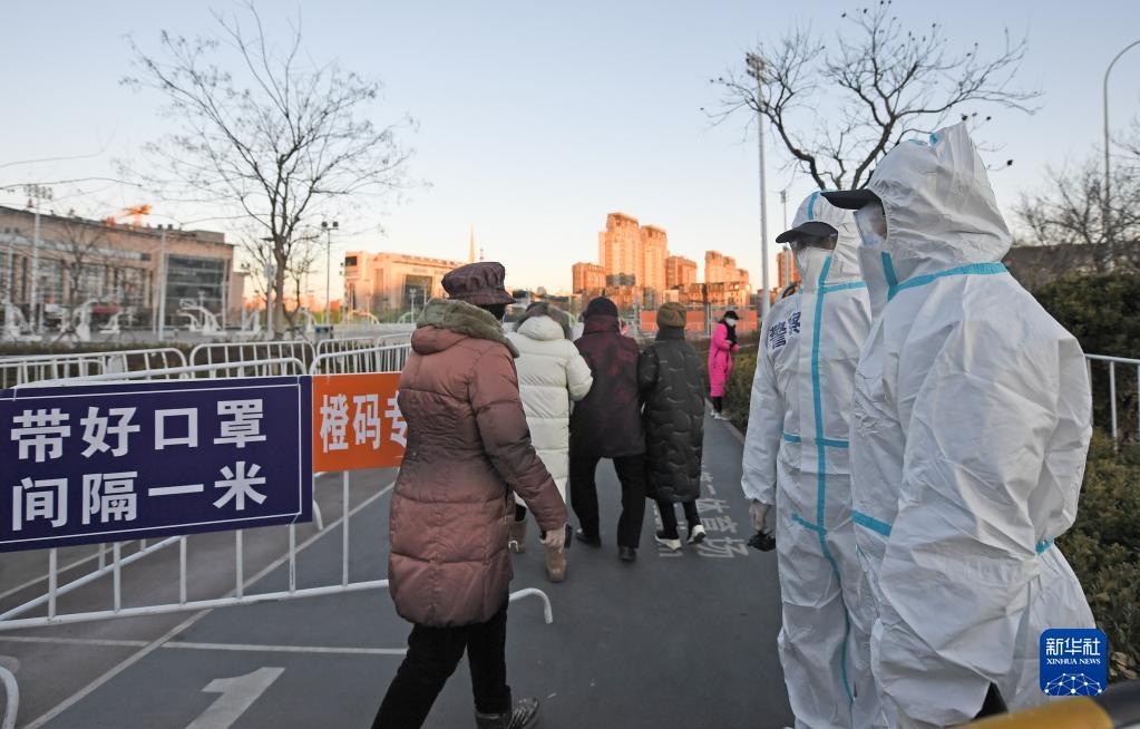 1月10日,天津市滨海新区公安局工作人员在一个核酸检测点入口处维护秩序。