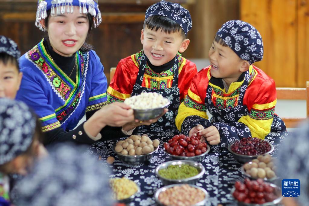 1月10日,贵州省铜仁市玉屏侗族自治县一幼儿园的老师在指导小朋友辨识熬制腊八粥的食材。
