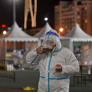 1月10日,在天津市滨海新区泰达第一体育场核酸检测点,工作人员在工作间隙品尝腊八粥。新华社记者 赵子硕 摄