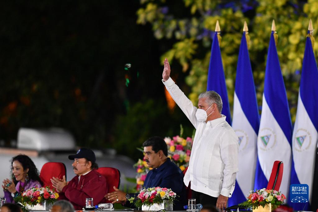 1月10日,在尼加拉瓜首都马那瓜,古巴国家主席迪亚斯-卡内尔(右一)出席尼加拉瓜总统奥尔特加新任期就职仪式。