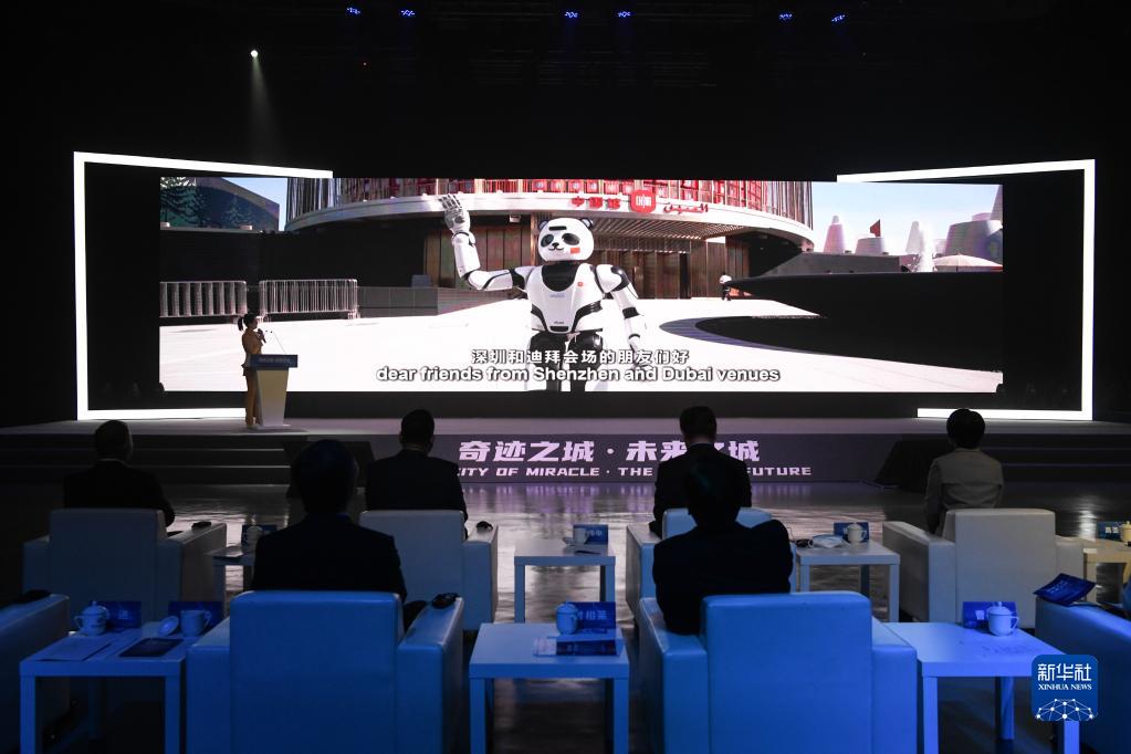 1月11日,在迪拜世博会中国馆“深圳日”启动仪式深圳现场,来自深圳的熊猫机器人在迪拜世博会中国馆前向两个城市的观众问好。
