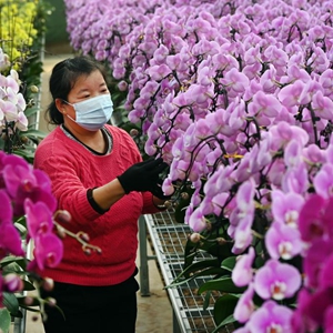 1月11日,花卉基地的员工在打理蝴蝶兰。