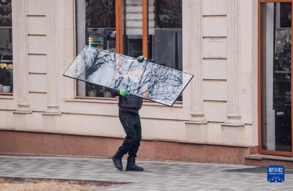 1月11日,工人在哈萨克斯坦阿拉木图街头搬运玻璃。