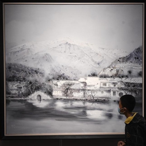 1月12日,参观者在海南省博物馆的“山川魂魄——中国南方油画山水研究展”上欣赏展品。
