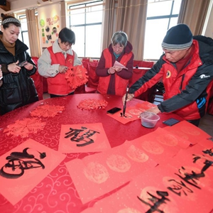 1月12日,星火村巾帼志愿者和村民在村文化礼堂制作糯米团子。