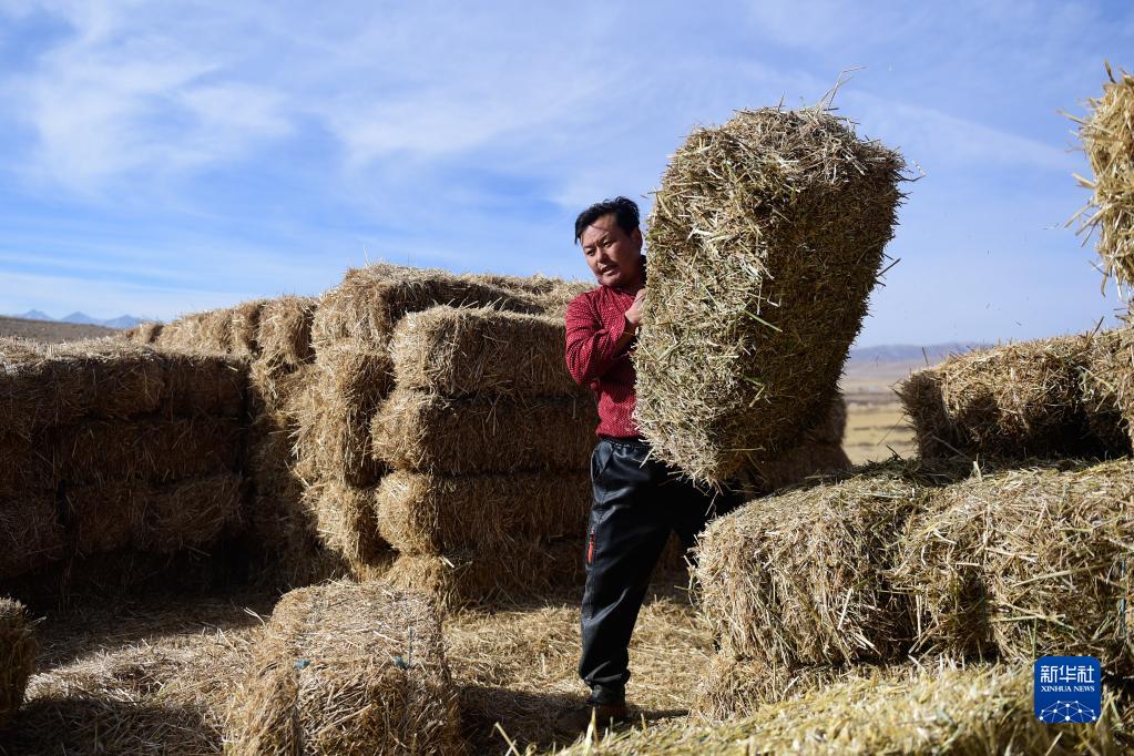 1月9日,在青海省海北藏族自治州门源回族自治县皇城蒙古族乡马营村,牧民准备牧草喂羊。