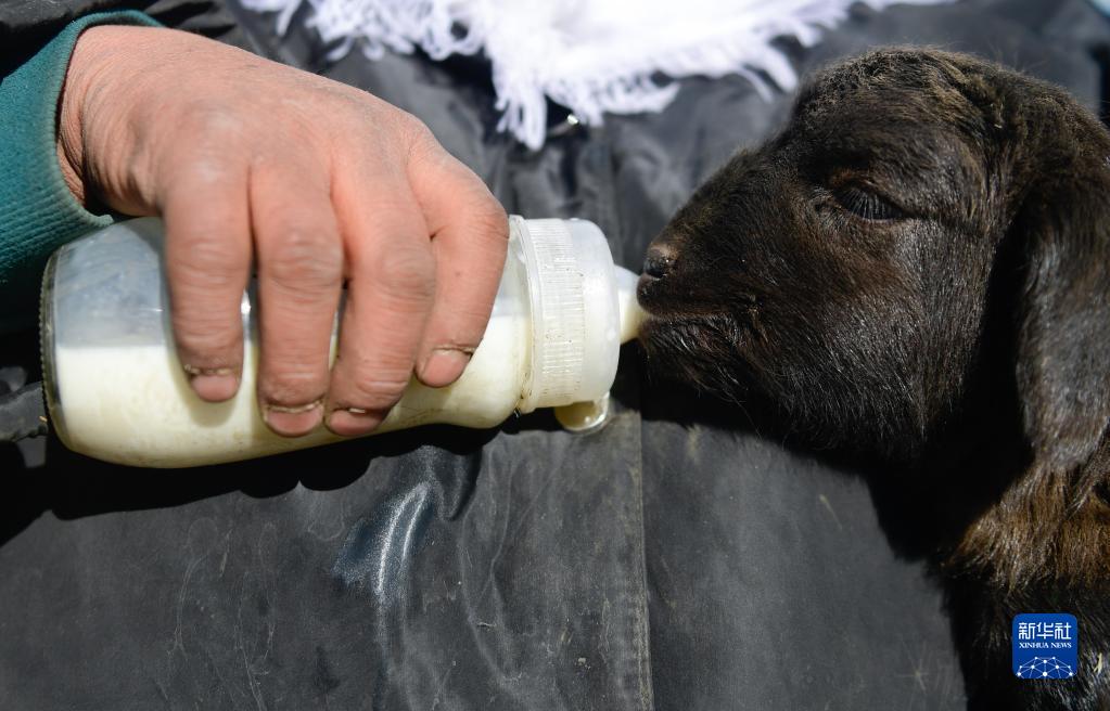 1月10日,在青海省海北藏族自治州门源回族自治县皇城蒙古族乡马营村,牧民给羊羔喂奶。