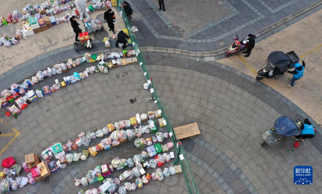 1月12日,下沉干部和志愿者在社区门前小广场接收居民线上购买的生活物资(无人机照片)。