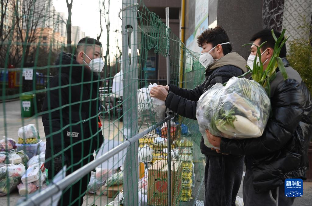 1月12日,志愿者(左)在社区门前小广场接收居民线上购买的生活物资。
