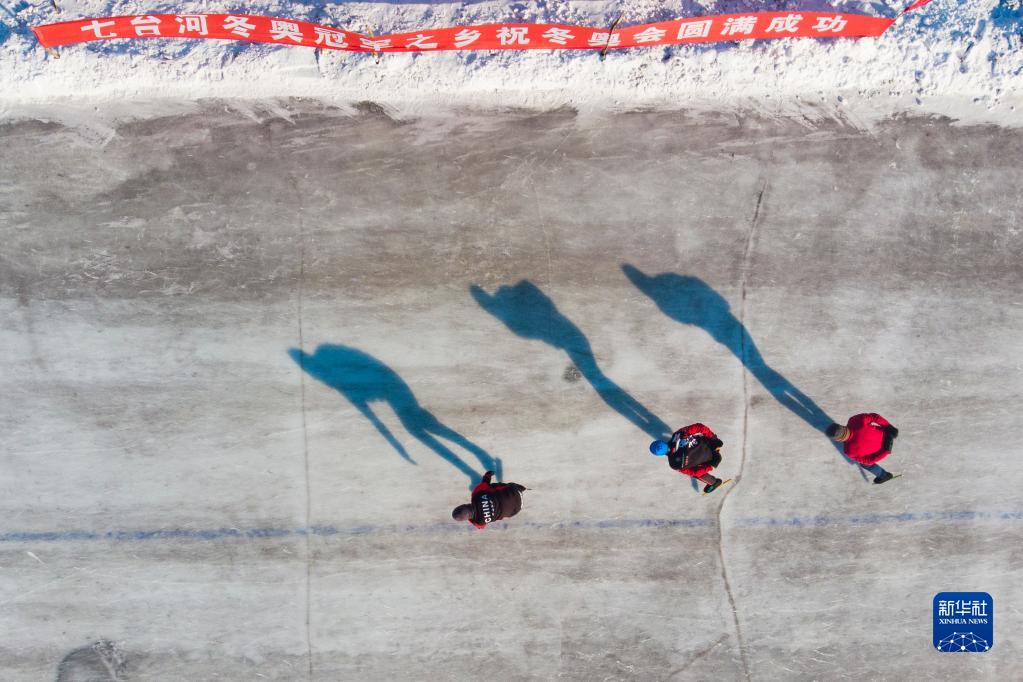 1月12日,滑冰爱好者在七台河市桃山区一处冰场滑冰(无人机照片)。