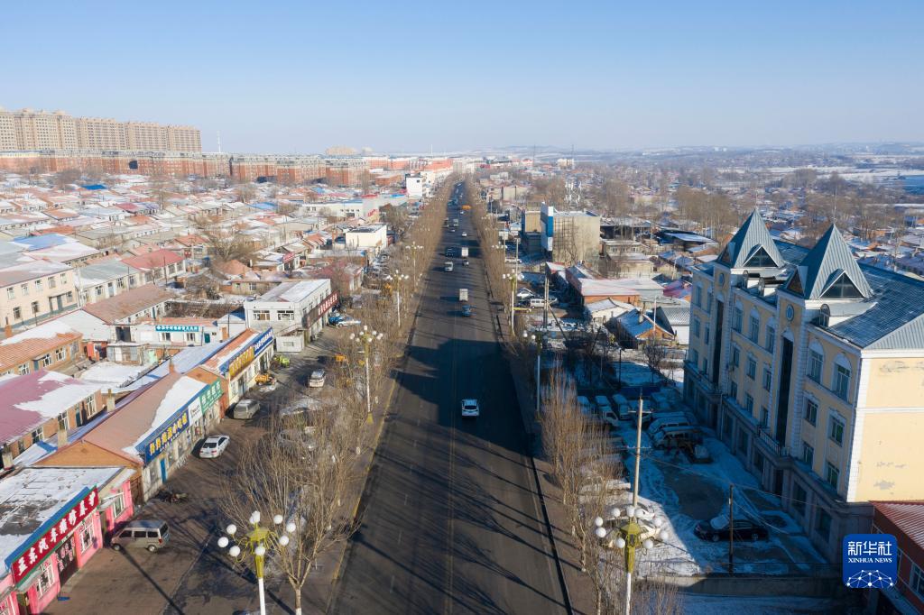 1月12日拍摄的七台河市茄子河区杨扬街街景(无人机照片)。这条街以我国冬奥首金得主杨扬的名字命名。
