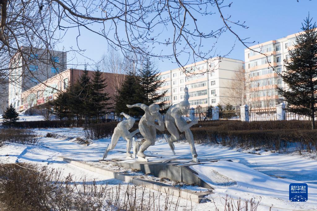 七台河市茄子河区杨扬街上的一处短道速滑主题景观(1月12日摄,无人机照片)。这条街以我国冬奥首金得主杨扬的名字命名。