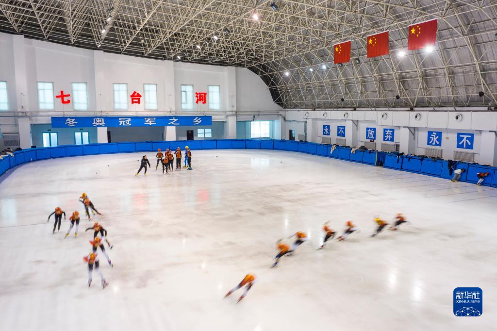 1月10日,七台河职业学院短道速滑训练中心的孩子们在七台河体育中心训练(无人机照片)。