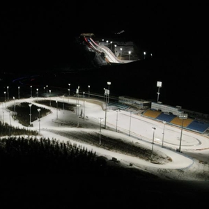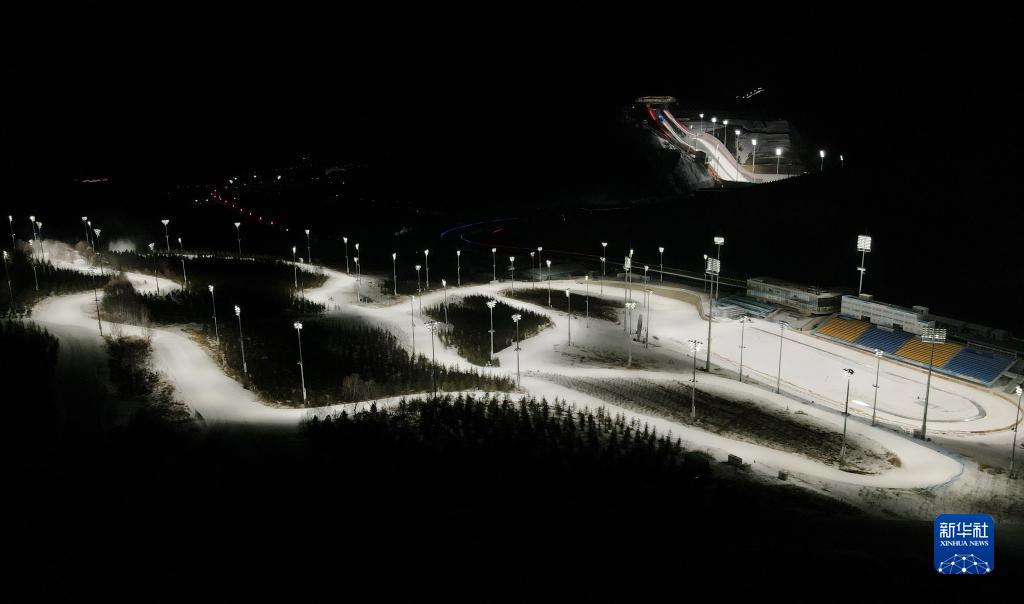 这是2021年12月30日拍摄的国家越野滑雪中心(下)和国家跳台滑雪中心(右上)夜景(无人机照片)。