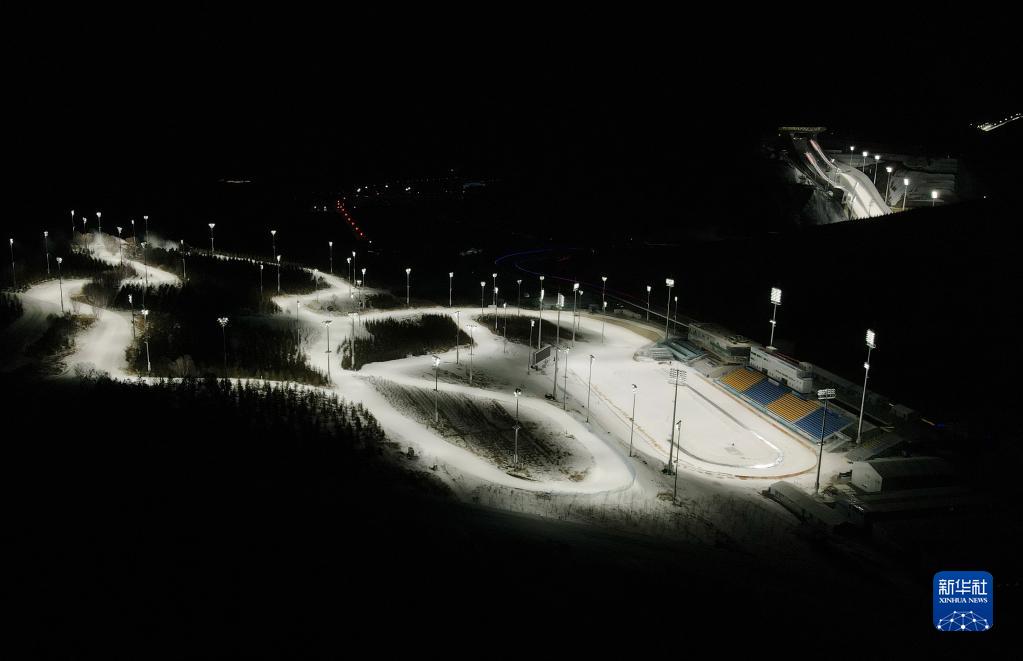这是2021年12月30日拍摄的国家越野滑雪中心(下)和国家跳台滑雪中心(右上)夜景(无人机照片)。