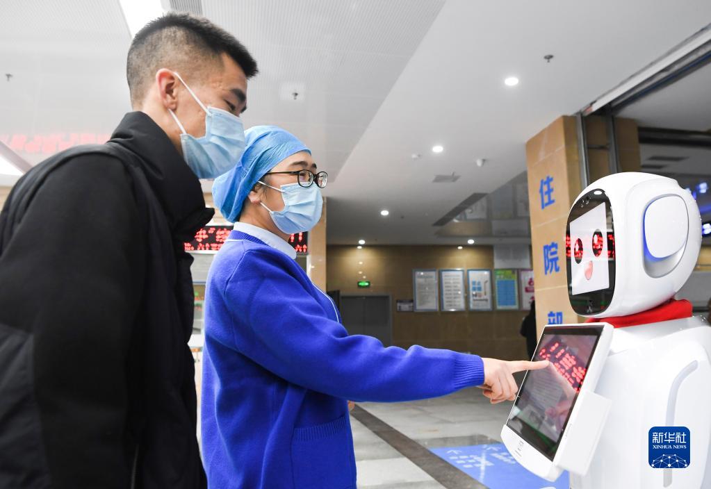 1月13日,重庆奉节县人民医院工作人员(左二)在新院区指导患者使用导医机器人。
