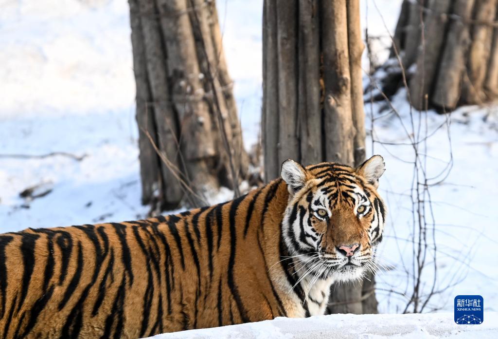 1月13日,在吉林省东北虎园内,一只东北虎在雪地上驻足。