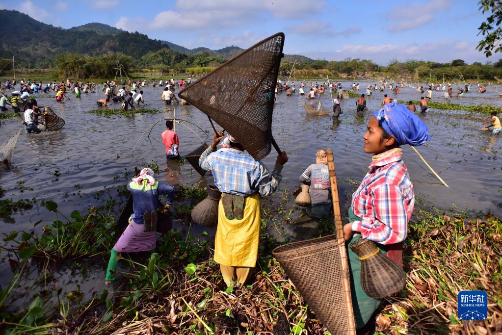 1月13日,在印度阿萨姆邦高哈蒂一处村庄,当地村民参加捕鱼活动,庆祝收获季的结束。新华社发