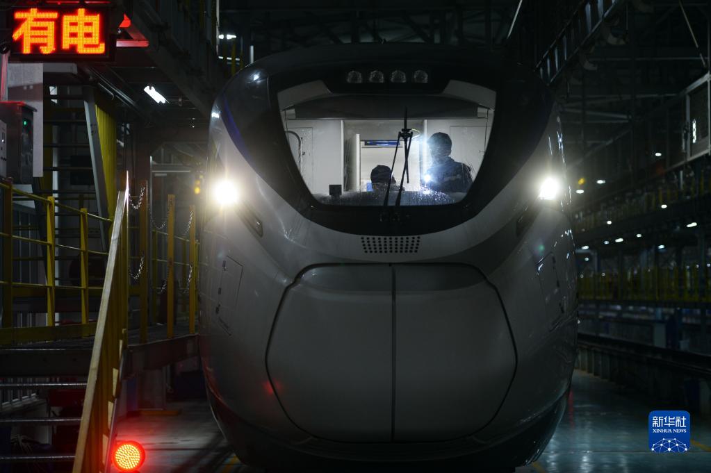 1月13日,广铁集团长沙车辆段职工调试列车设备。