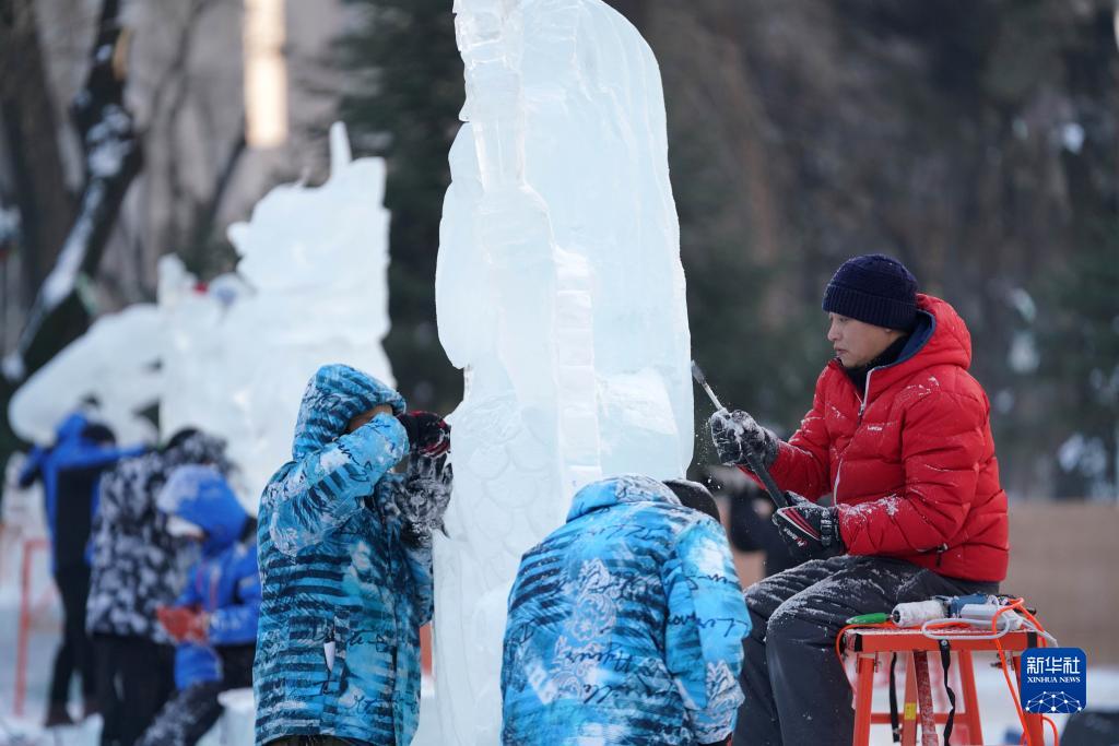 1月7日,冰雕师在哈尔滨冰灯艺术游园会园区创作艺术作品。