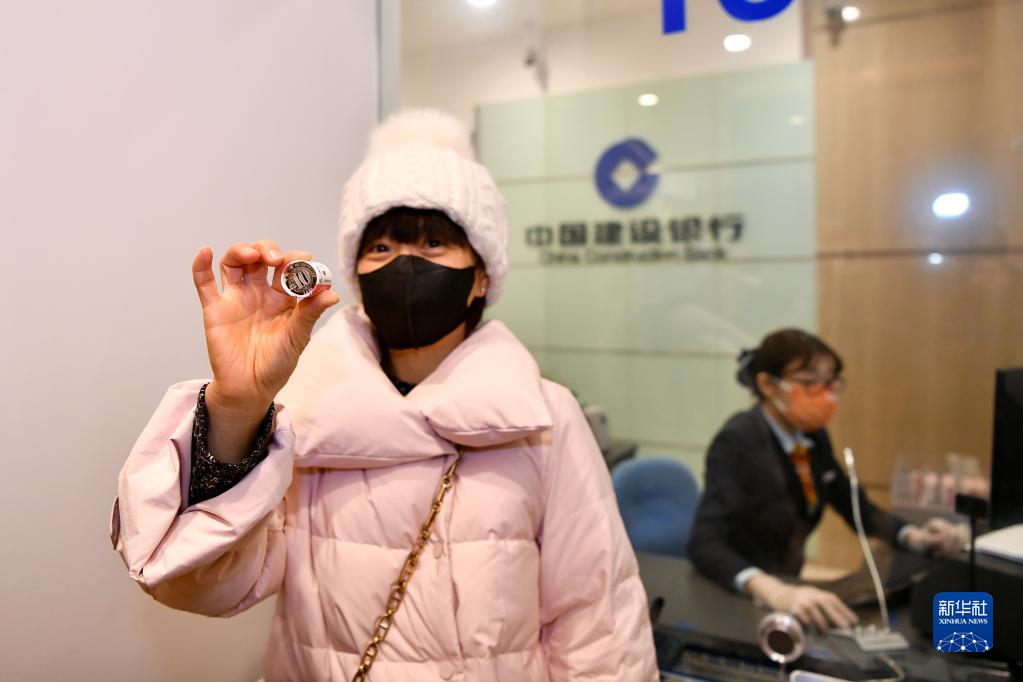 1月14日,市民应女士展示在中国建设银行北京兴融支行兑换的2022年贺岁双色铜合金纪念币。