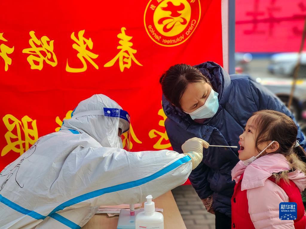 在安阳市文峰区紫薇大道街道春光路社区,医护人员为一名小朋友进行核酸检测取样(1月11日摄)。